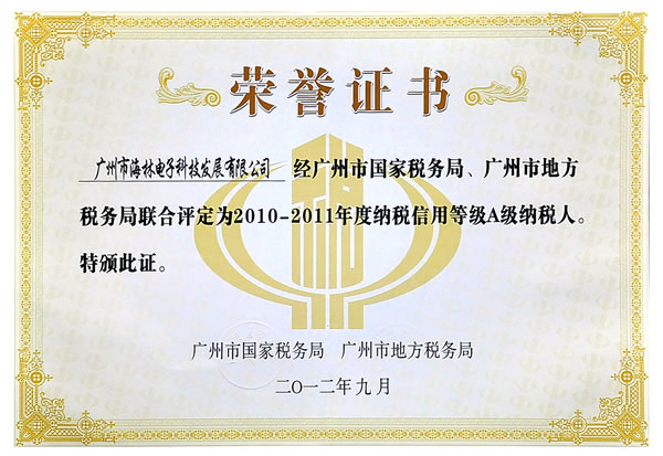 等级A级纳税人证书