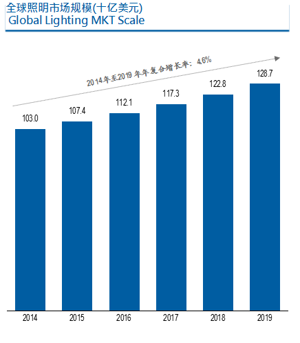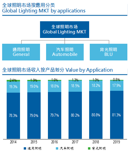林纪良先生援引资料表示,全球照明市场整体规模到2019年预计将达到1287亿美元,2014年至2019年年复合增长率预计达到4.6%。按产品划分,全球照明市场可分为通用照明、汽车照明和背光照明。其中,通用照明为主要产品,占整体全球照明市场总额的80%左右。