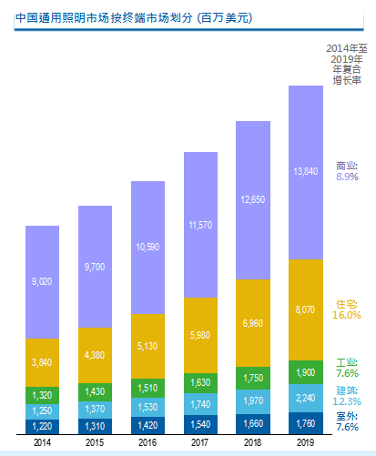 按终端市场划分,中国通用照明市场可分为商业(包括酒店、办公及商店)、住宅、工业、建筑及室外五大市场,其中商业领域是最大的市场板块,占2014年整体市场规模的54.2%。而受益于城市化进程以及繁荣的房地产行业发展,住宅领域预计为2014年至2019年增长最快的领域,复合增长率达到16.0%