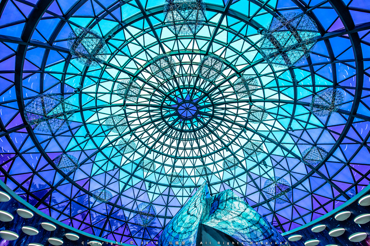 这座地铁站的头顶,是直径21米的渐变蓝色玻璃穹顶,阳光穿透,像一朵绽开的蓝莲花。在地面上看,它是一颗巨大的晶莹蓝色水晶球,像巴黎卢浮宫露出地面的玻璃金字塔。954块钢化玻璃制成,双层玻璃里注入氮气,隔热隔紫外线,能承受6500人同时站在上面。